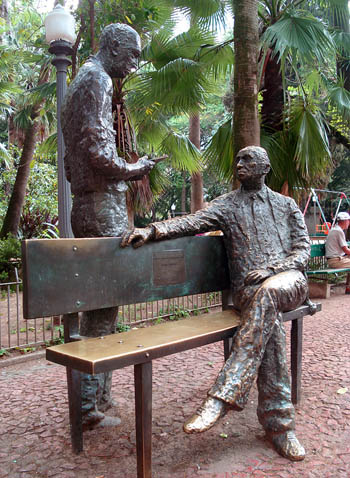 Prestei minha homenagem a Mário Quintana, poeta gaúcho que faz poesia parecer algo muito simples, de nenhum esforço: adquiri Poesia completa, por então nada desprezíveis cento e noventa reais, isso em 2006. Hoje deve valer bem mais que o dobro. São mil páginas organizadas, preparadas, prefaciadas e anotadas por Tânia Franco Carvalhal. (Como as mulheres se vêm destacando nos estudos literários e linguísticos!) Lá estão todos os seus livros em versos, desde A rua dos cataventos (1940) até Velório sem defunto (1990), além da fortuna crítica a cargo de Augusto Meyer, Guilhermino César, Paulo Rónai, Gustavo Corção e Paulo Mendes Campos, nomes de peso da cultura brasileira. Porto Alegre com uma escultura que reúne Quintana (sentado) e Carlos Drummond de Andrade (em pé), na Praça da Alfândega, pereniza em bronze o grande poeta, que não tem apenas valor regional. Sua poesia não é localista, nem mesmo nacional. Tende mais ao universal, porque fala a todos e expressa a condição humana, explorando a reflexão sobre a vida e sobre a morte. A maior e mais concreta homenagem que Mário Quintana recebeu em vida não foi de nenhuma academia, de nenhum crítico de renome. Foi de um admirador sincero, Falcão, o elegante jogador de futebol que mereceu em outros tempos o belo título de rei da Roma: Quintana, solteirão, morava num hotel de Porto Alegre. Com a passagem do tempo, seus recursos financeiros minguaram a ponto de ele já não ter como pagar a hospedagem. Então o elegante Falcão, hoje técnico de futebol e/ou comentarista de televisão, não teve dúvida: combinou com os proprietários do Hotel Majestic que se encarregaria de todo o pagamento. E assim, o poeta pôde viver sossegado ali, entre 1968 e 1980. Leio que o prédio do antigo Majestic abriga a Casa de Cultura Mário Quintana – o que não é pouco num país tão desleixado de seus melhores valores morais e intelectuais. Vale a pena ter, ao menos, a Antologia poética de Mário Quintana, preparada por Rubem Braga e Paulo Mendes Campos e lançada pela sempre lembrada Editora Sabiá, em 1966, que acabou dando ao poeta o reconhecimento nacional.