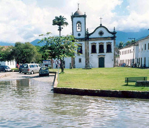 Quem conhece Paraty sabe: a cidade, belíssima com suas montanhas verdejantes, com seus casarões coloniais, com suas ruas de rude calçamento, com seus imensos quintais arborizados, torna-se pitorescamente imbatível com o auxílio da maré. Lá pelas tantas, com precisão japonesa, o mar sobe, invade as ruas, inunda as casas de sempre, apanha desprevenidos turistas, de repente ilhados no hotel, na tosca pousada de mobiliário rústico e forro de taquara trançada, na loja, no bar da esquina. Quer dizer, Paraty, embora não tenha boas praias, tem a conivência do mar, o luxo das lanchas e das escunas, a vida boêmia despoliciada, o mundanismo social sem freios, a localização a meio caminho entre São Paulo e Rio. A cachaçaria da cidade é um luxo de variedade e sofisticação. Vi lá – só vi – um litro de pinga produzida em Salinas – MG com o modesto preço de seiscentos reais! Isso há quatro ou cinco anos.