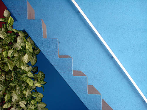 Linda foto! É da sua casa, com certeza. Vamos "filosofar" lato sensu: Ernesto Grassi (Arte e Mito. Lisboa: Livros do Brasil - Lisboa, s/d, p.10,12 e 35, entre outras), tendo experimentado o terror da natureza virgem, diz que esta é o puro inóspito e que, se não houver um projeto humano medianeiro entre nós e ela, estamos no reino da absoluta incomunicabilidade. A arte é uma tentativa de aprisionar e delimitar a natureza por meio de projetos humanos que detenham seu constante fluxo e evanescência. A arte instaura um mundo e uma ordem "nos quais uma multiplicidade se transforma numa totalidade". A arte alcança "a totalidade de um cosmos, de um mundo ordenado". Voltando à sua foto, dentro desse referencial: aquilo que na sua casa (suponho que seja a sua casa) é uma multiplicidade converteu-se numa totalidade, através do corte estético que você (suponho que foi você) engendrou. Nasceu um quadro cuja beleza reside em quatro aspectos: 1) no contraste entre a natureza viva e vicejante da folhagem e o cimento armado da escada - contraste que subentende um confronto, porque tanto na folhagem quanto na escada há um projeto humano - provavelmente um vaso na primeira e formas geométricas na segunda. 2) no enquadramento diagonal absolutamente simétrico do corrimão e da linha inferior da escada. 3) no jogo das cores. 4) no mistério incapturável que perpassa a cena, meio surreal, escada de Jacó que vai e vem. Enfim, você está de parabéns. Célia Mariana Franchi Fernandes da Silva