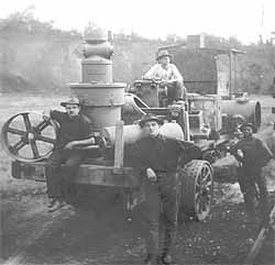 Sobre o caminhão, um motor a gás "Otto Dustz" que seria embarcado para Carapicuíba, na estação da Mogiana. Sobre o caminhão está Ítalo Piovesan. No plano inferior: Attilio Piovesan (o pai, sentado), Luiz Duílio Piovesan e um ajudante não identificado.